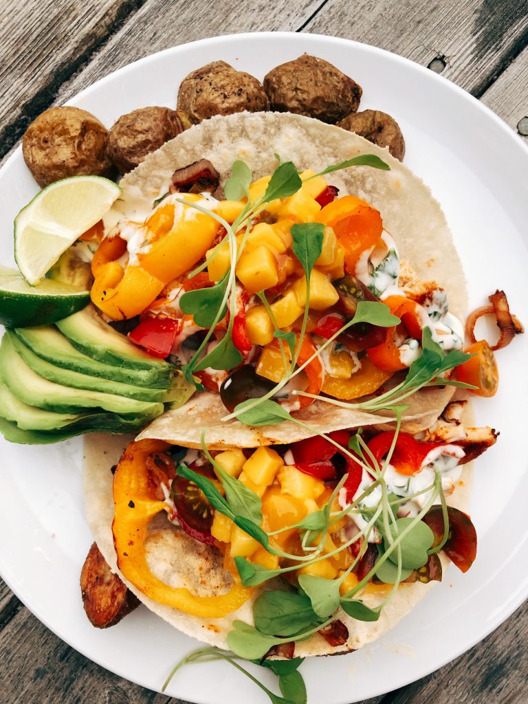Rinse and pat dry chicken breasts and coat with avo oil. Sprinkle seasoning generously on both sides of the chicken breasts. You can choose to pan fry these is a cast iron skillet (cooking completely on one side and the flipping once in avo oil) or on the BBQ. I grill mine on the BBQ flipping once until internal poultry temperature is reached. While your chicken is cooking, heat 2 tbsps or avo oil in a pan and add shallots and peppers seasoning with salt and pepper and sauté until softened. Remove chicken from heat and let rest. Prep you lime crema adding all ingredients to a small bowl and whisking. Add more mayo to the crema if the consistency is too runny. Heat tortillas on the skillet and slice chicken breast into strips. Load some of the chicken, pepper mixture, toppings (i used baby tomatoes) top with a few spoonfuls of the lime crema, mango salsa and add garnishes (avocado, microgreens and lime wedges).