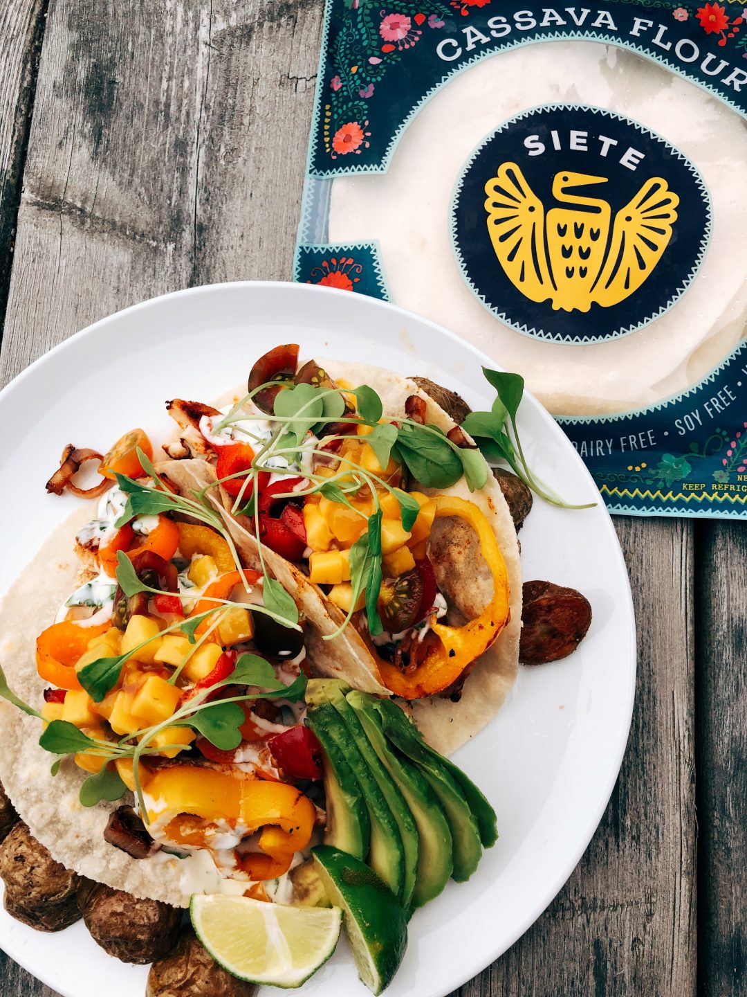 I made this recipe twice since I developed it because they are so dang good. Unreal good. You need to go make these for dinner ASAP good. It all started with mango salsa. I Purchased a container of pre-made mango salsa with a plan in mind. Now, I normally would make my own salsa, but ya girl is très busy and sometimes convenience is the name of the game. A few weeks ago, while in Boston, I hit up a Whole Foods and went full on SAVAGE throwing everything I could in a cart. Siete Foods products are some of my faves. They make grain free, gluten free, vegan products that are top notch. I bought 6 packs of their tortillas (they carry almond, cashew, and cassava, cassava and chia and chickpea flour tortillas) and stuffed them in my luggage in hopes they would make it home safely. They remain frozen, until you’re ready to use them! Pop then on a griddle for 20-30 seconds per side and BAM. Perfection. You could easily make this recipe with lettuce wraps, flour or corn tortillas or even taco shells. Everybody wins! WOO!