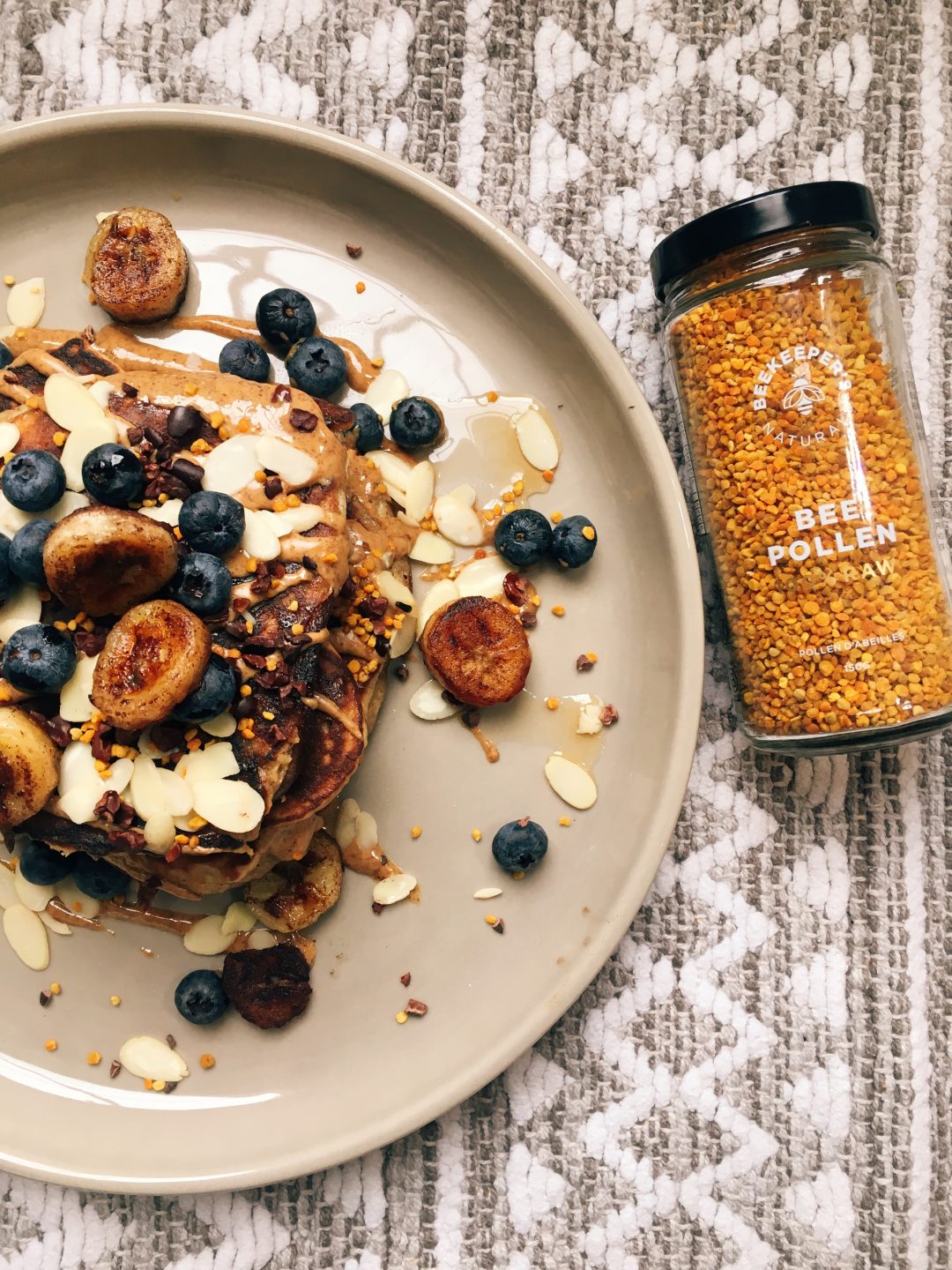 There’s a fine line between a good and a bad pancake experience. It’s all about texture. If your batter is too thick, you end up with little disks of dust. If they’re too runny, you end up with a mess in the frying pan. You want your batter a little more runny than a pudding, and VOILA! Perfect pancakes. Add some chocolate chips ( i use Enjoy LifeĀ or bluebs) and top them off with your faves! I love berries, cacao nibs, almond slivers, hemp hearts, a drizzle of almond butter and maple syrup. Recently, I purchased bee pollen from Bee Keeper’s Naturals. It’s delicious and one of nature’s most nourishing foods. Packing more protein per gram than any other animal product, it’s stacked with easily digestible free-forming amino acids and chock full of vitamins, minerals and a full spectrum of essential nutrients. Plus, they source their bee products sustainably and by hand without over harvesting the bees. Winning!