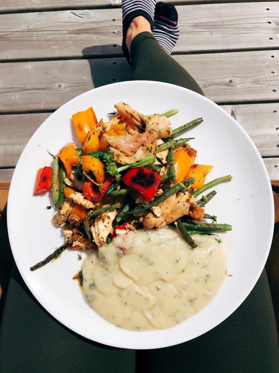 Today’s recipe is a quick and easy pesto chicken stir fry with a creamy cauliflower mash. It’s funny to me how dishes come and go in popularity. Instagram seems to be jam packed with recipes for oats, avo toast, celery and cilantro juice, and everything keto (including cauliflower all the ways – riced, mashed, roasted, made into a pizza dough etc etc…). I thought I’d hop on the bandwagon and see what I could come up with. I’m not keto by any means, but I’m definitely here for trying new ways to prepare veggies. When it comes to nutrition and diet, we all have different paths. Find something that works for you, don’t get sucked into the latest trend, keep an open mind and never judge someone for the choices they make. You do you, boo. We are nothing without our health, so treat your body and minds with kindness and care and reap the benefits!